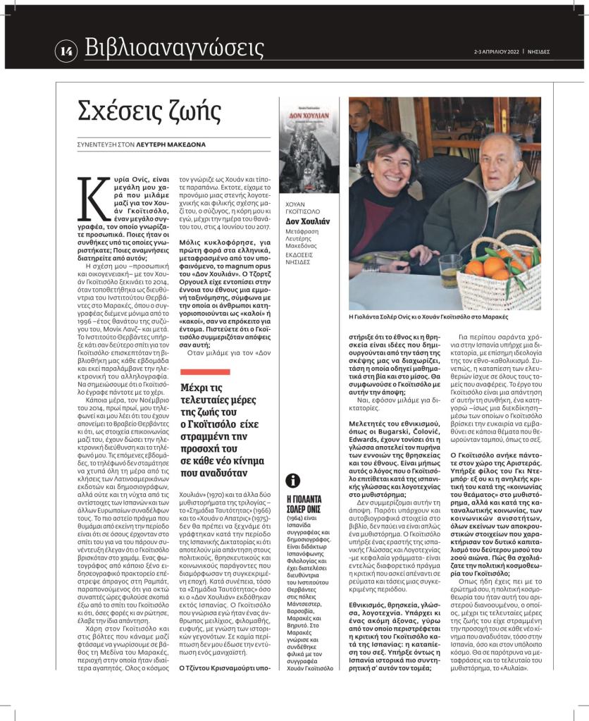 Στο φύλλο Σαββάτου-Κυριακής (2-3.4.2022), τής Εφημερίδας των Συντακτών και ειδικότερα στο ένθετό της Νησίδες, μία συνέντευξη, που είχε την ευγένεια να μου παραχωρήσει μία παλιά οικογενειακή φίλη τού Ισπανού συγγραφεά Χουάν Γκοϊτισόλο. Με την ευκαιρία τής έκδοσης, σε μετάφρασή μου, του magnum opus τού Γκοϊτισόλο, «Δον Χουλιάν», η κα Yolanda Soler Onís, η οποία έχει διατελέσει επί δεκαετίες διευθύντρια του Ινστιτούτου Θερβάντες σε διάφορες πόλεις ανά τον κόσμο κι η οποία γνώρισε τον Γκοϊτισόλο κατά τη διάρκεια της διαμονής της στο Μαρακές (2014-2017), μιλάει για τις αναμνήσεις που διατηρεί από τον Γκοϊτισόλο, για τα πολλαπλά επίπεδα στα οποία αναπτύσσεται το μυθιστόρημά του «Δον Χουλιάν», αλλά και για το σύνολο του λογοτεχνικού του έργου. Ευχαριστίες στον κο Βουλέλη και στην ΕφΣυν για τη δημοσίευση της συνέντευξης.